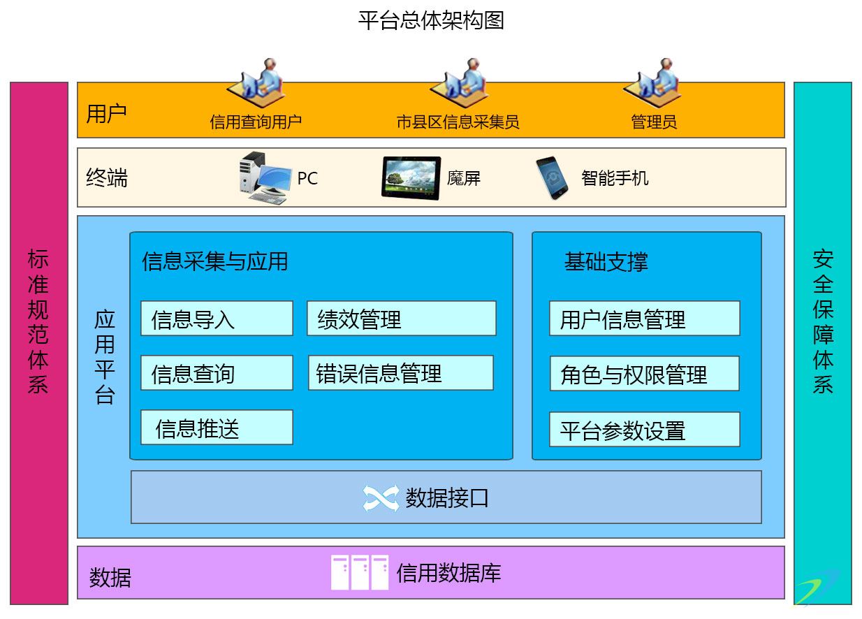 平臺(tái)的主要用戶(hù)為信用查詢(xún)用戶(hù)、市縣區(qū)信息采集員,平臺(tái)管理員。用戶(hù)通過(guò)終端訪問(wèn)應(yīng)用平臺(tái)各項(xiàng)功能,包括信用信息查詢(xún)、導(dǎo)入、推送、錯(cuò)誤信息管理;管理員可進(jìn)行信用歸集績(jī)效管理,平臺(tái)設(shè)置。平臺(tái)提供數(shù)據(jù)接口,與外部應(yīng)用進(jìn)行信息交換。